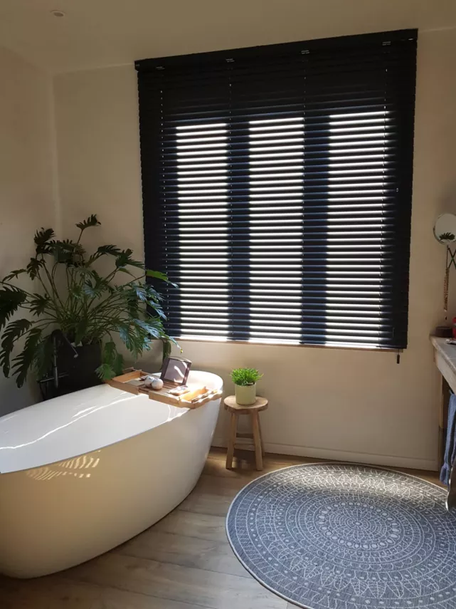 Horizontale zwarte lamellen voor een moderne look in de badkamer.